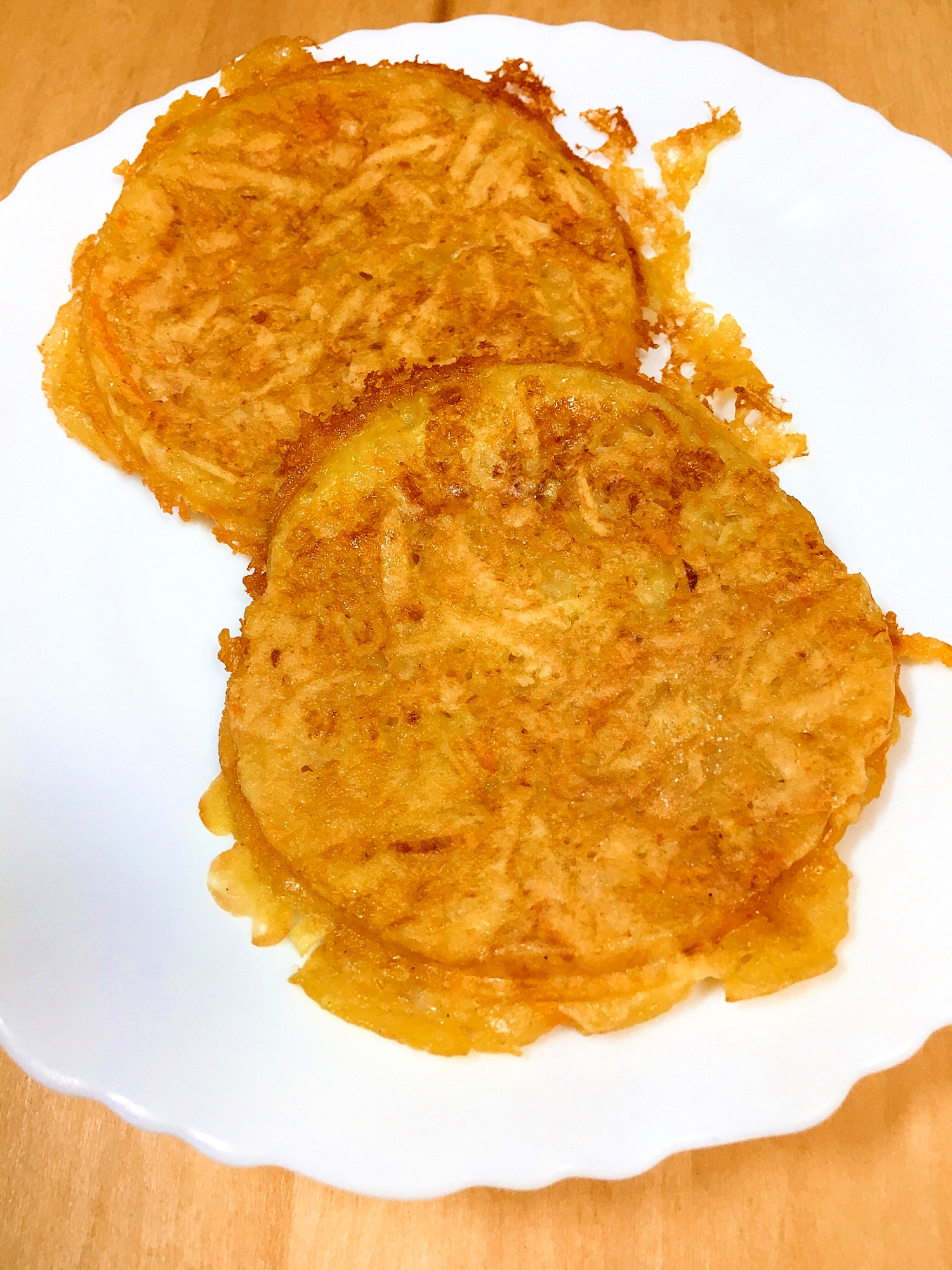 材料(2人分)じゃがいも 2〜3個(約250g)玉ねぎ 1/2個A溶き卵 1/2個分片栗粉 大さじ2塩・こしょう 各適量サラダ油 適量付け合せスモークじゃがいもと玉ねぎを15cm角くらいにカットし、フードプロセッサーに入れる。 塩・こしょう、卵、小麦粉も加えて撹拌する。 (細かくしすぎない) 大きめのフライパンにオリーブオイルを入れて温め、1を大きめのスプーンですくって落とし平らに丸く 作り方 1 ボウルに、すりおろしたじゃがいも・パンケーキミックス・牛乳を入れて混ぜ合わせる。 (じゃがいもは空気に触れると黒く変色してしまうので、焼く直前に生地を作りましょう) 2 薄ーくフライパンに油をひいて、生地を流し込み弱火で片面1分づつ焼く。